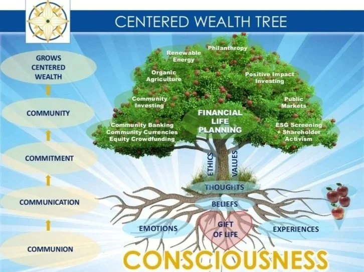 As the Centered Wealth tree model illustrates, the path to widening the lens of economy and finance begins with an investment of attention inward to re-establish a reliable internal experience of communion with Life. From this foundation, we are then better able to communicate and effectively engage with others who share our common vision. This in turn creates new emergent markets to support the fresh societal trends. This ever-present social dynamic, served by the transactional efficiency of money, is what builds a renewed expression of community which, for the active citizen, is the seat of true resilience and commonwealth.